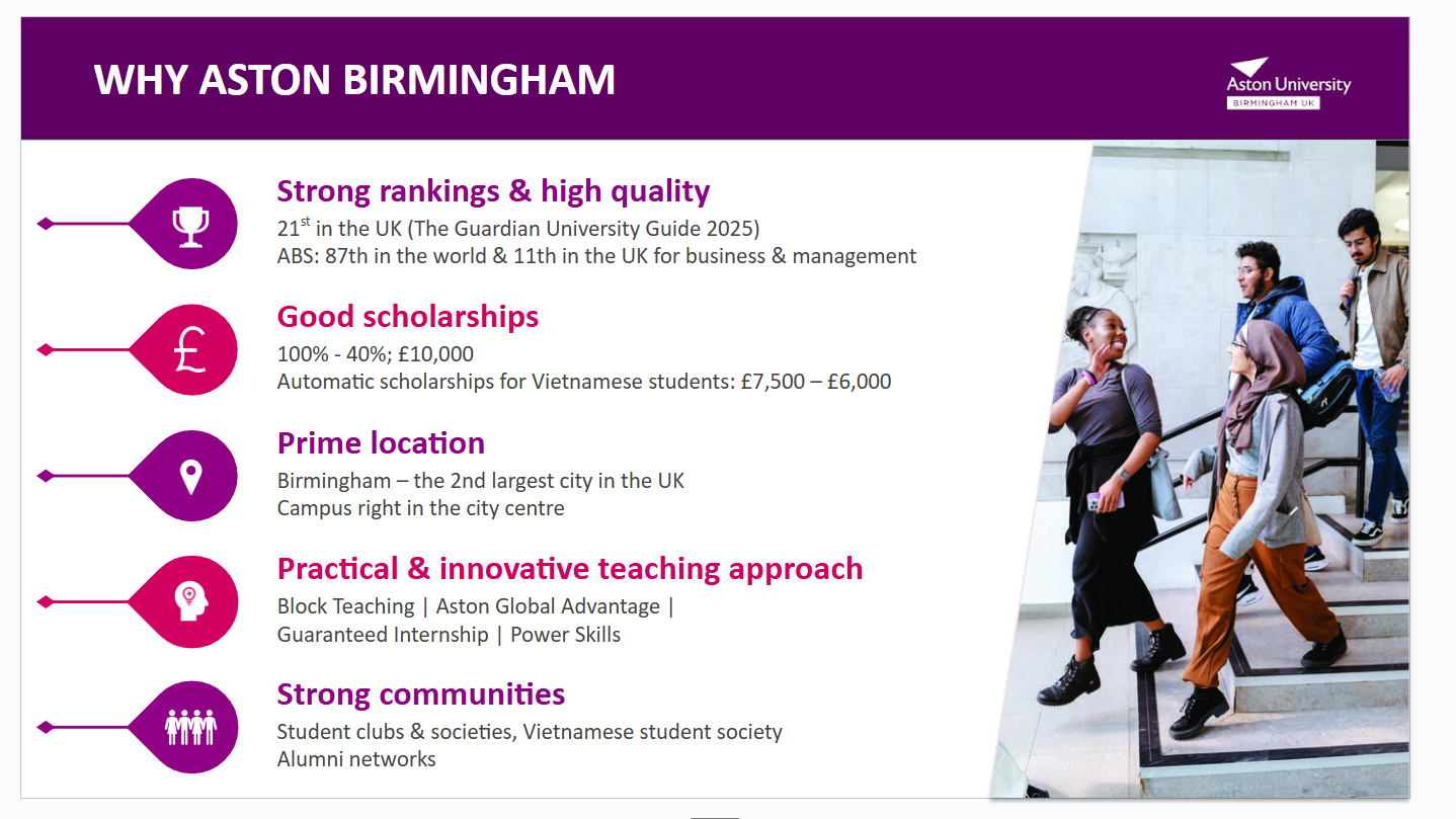 Một trong những lý do khiến Aston University thu hút du học sinh Việt Nam là chương trình học bổng phong phú. Trường dành hơn 5 triệu bảng Anh mỗi năm cho học bổng quốc tế, với các gói tự động dành riêng cho sinh viên Việt.